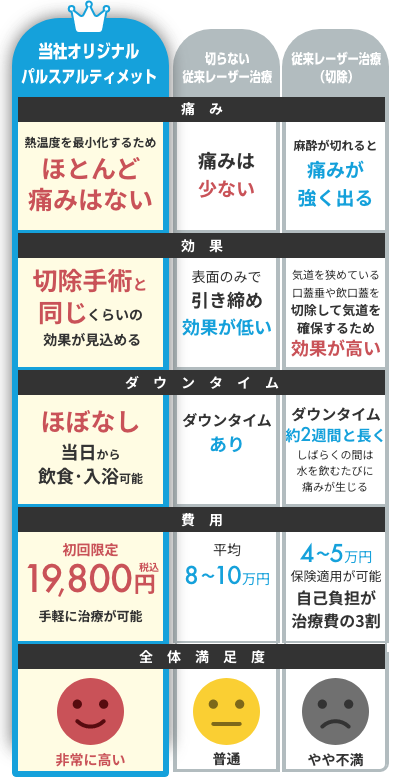一方、レーザー治療パルスアルティメットは、いびきの根本原因にアプローチし、持続的な改善を目指す根本治療法です。装置の煩わしさがなく、治療後の快適な睡眠が期待できます。日常生活の中で自然にいびきが軽減する効果を実感していただけます。
